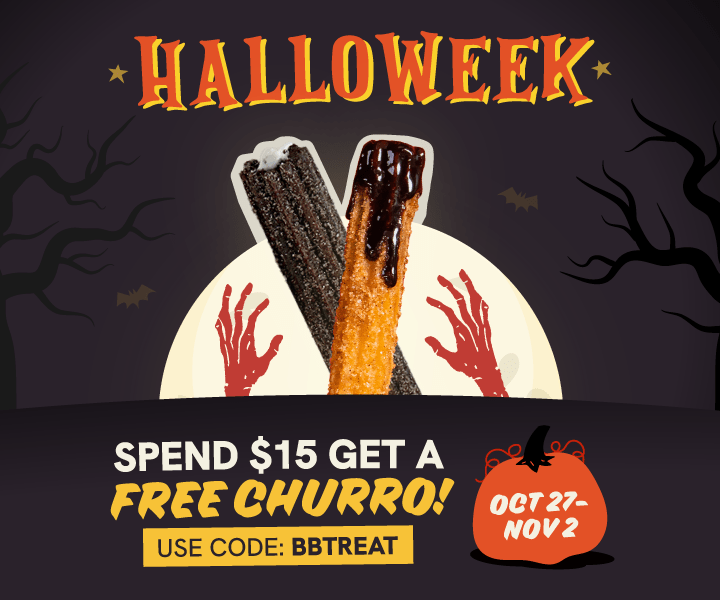 Time For A Treat!Get a FREE churro this Halloweek at BarBurrito when you spend $15 on an order from October 27 - Nov 2! For online orders use the code BBTREATLEARN MORE