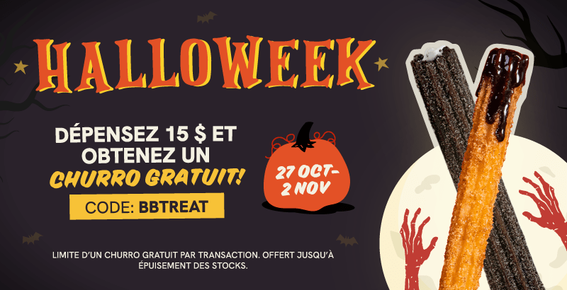 Du 27 octobre au 2 novembre, recevez un churro GRATUIT avec tout achat de 15 $ ou plus.