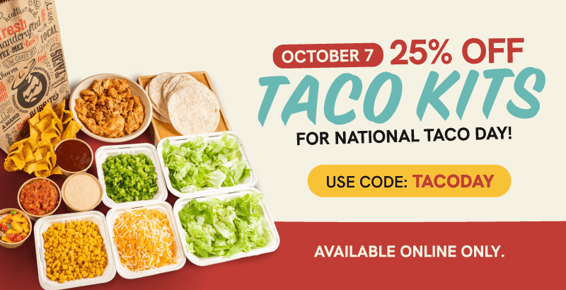 Celebrate with our Taco kits that are 25% off when you order online with the code TACODAY