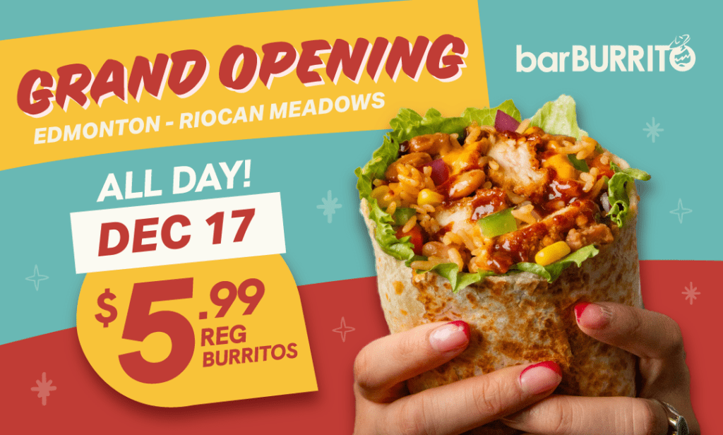 Celebrate the grand opening of BarBurrito Edmonton – RioCan Meadows with us on Wednesday, Dec 17, 2025. Regular Burritos will be only $5.99 all day long! Don’t miss out; this event is one day only.