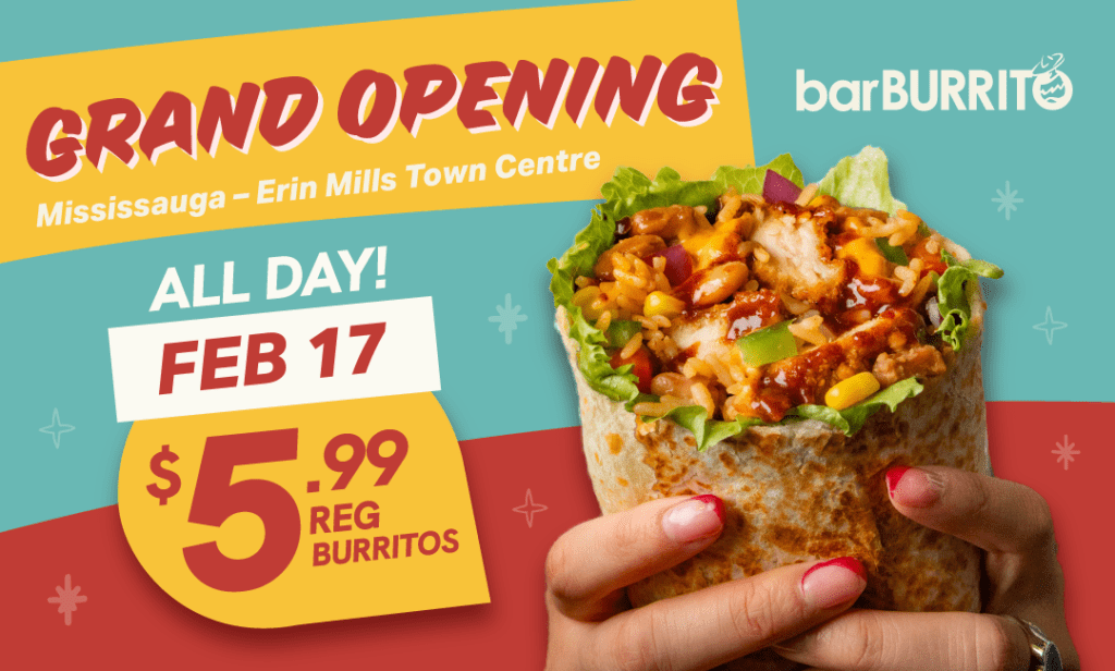 Celebrate the grand opening of BarBurrito Mississauga – Erin Mills Town Centre with us on Tuesday, Feb 17, 2026. Regular Burritos will be only $5.99 all day long! Don’t miss out; this event is one day only.