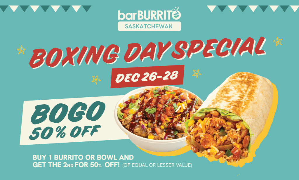 Our Boxing Day Special is one you won’t want to miss! From December 26–28, buy one burrito or bowl and get the second for 50% off 🔥 The discount applies to the item of equal or lesser value, with size upgrades available.