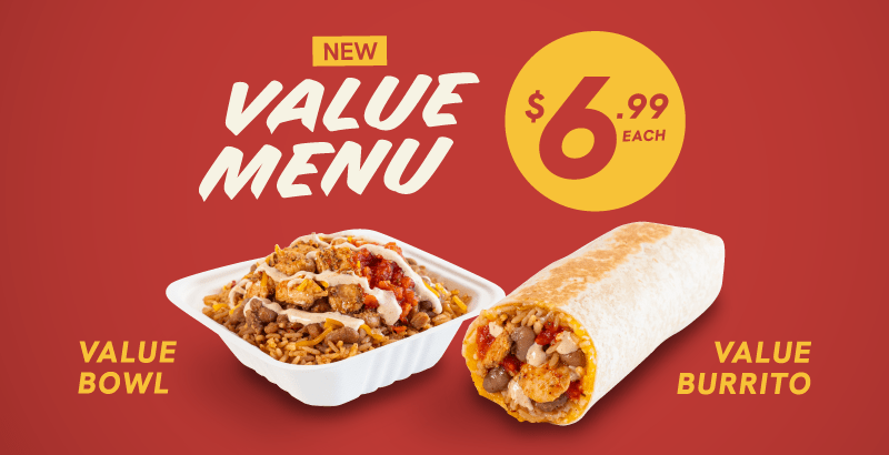Enjoy a Value Burrito OR Value Bowl with a choice of protein, beans, cheese, salsa and one sauce.