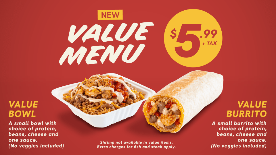 Enjoy a Value Burrito OR Value Bowlwith a choice of protein, beans, cheese, salsa and one sauce.