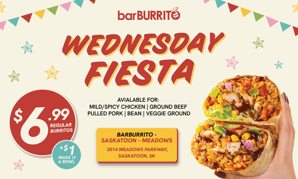 🌯 Join us this Wednesday for our Wednesday Fiesta at BarBurrito Saskatoon Meadows! Enjoy a delicious regular-sized burrito for just $6.99, available all day long at our location at 3014 Meadows Parkway, Saskatoon, SK.