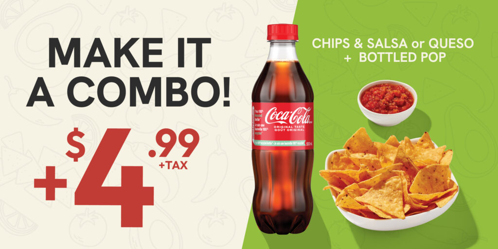 Get crispy chips with your choice of salsa or queso, plus a refreshing bottled drink: including soda, Jarritos, or water.