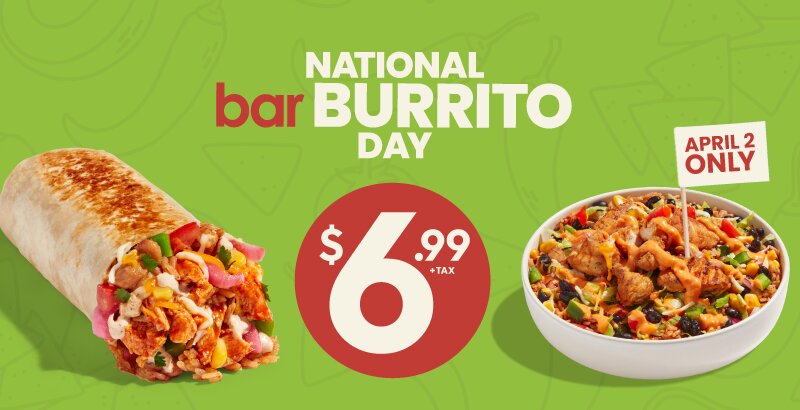 *Valid at participating locations. Taxes extra. National Burrito Day offer available April 2, 2026 in-store, on the BarBurrito app & across participating delivery platforms. Crunchy Chicken, Crunchy Fish, Falafel, Steak, and Shrimp not included. $9.99 on third party orders and zero charge delivery, offer valid April 2, 2026 only. Pricing on third party delivery platforms may vary. Limit 2 regular burritos or bowls per customer. Other fees may apply.*